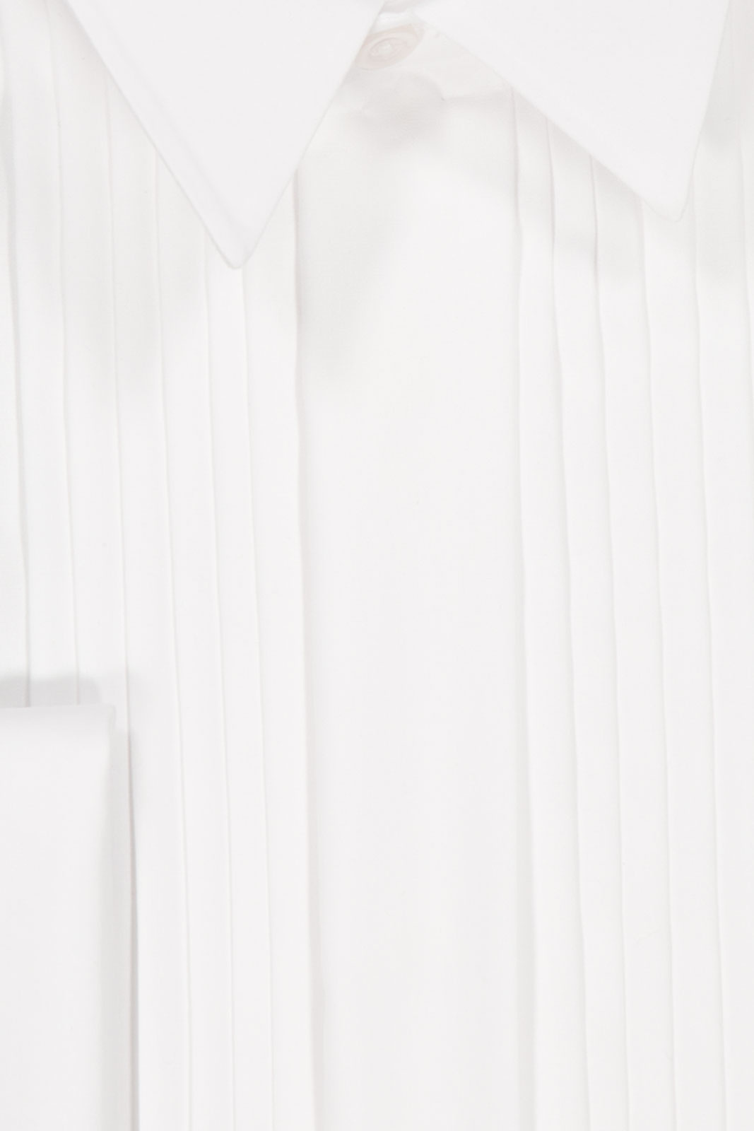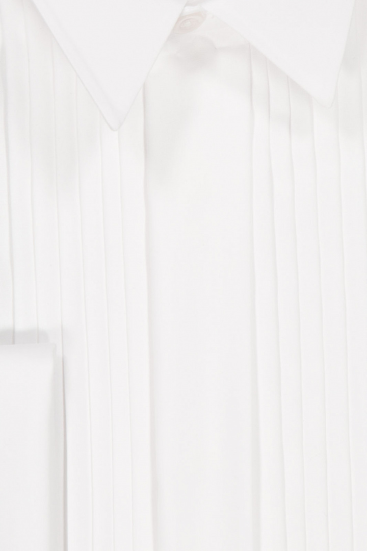 Skjortan har en smokingk rake och fransk manschett, vilket ger ett exklusivt intryck och möjligheten att bära stilfulla manschettknutar. Den dolda knappuppknäppningen framtill bidrar till en elegant, ren front och en minimalistisk estetik som verkligen understyrker dess formella karaktär. Plisserade detaljer ger en subtil rörelse och en unik finish som gör att plagget känns särskilt genomtänkt och distingué.