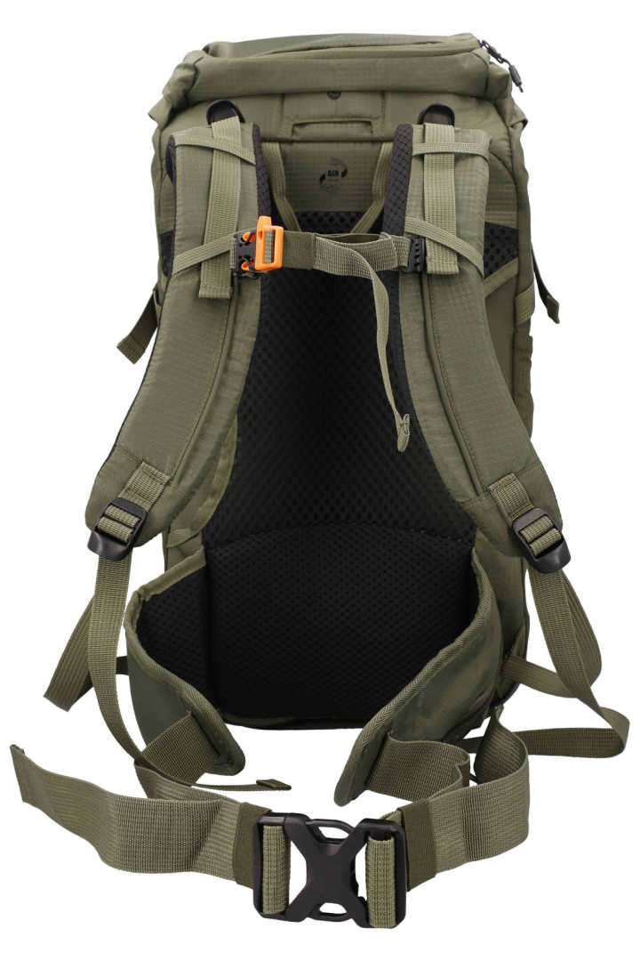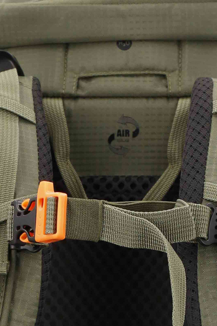 Passformen är utformad för komfort under längre vistelser i naturen. Justerbara och vadderade axelremmar styrs enkelt efter din kropp, och den vadderade bakpanelen med 3D-nät ger bra ventilation och komfort mot ryggen. Ryggsäcken är dessutom utrustad med regnskydd som ligger under själva ryggsäcken, så du snabbt kan skydda packningen vid oväntat väder. Den unika designen inkluderar även en nödvisselpipa för extra trygghet i vildmarken.