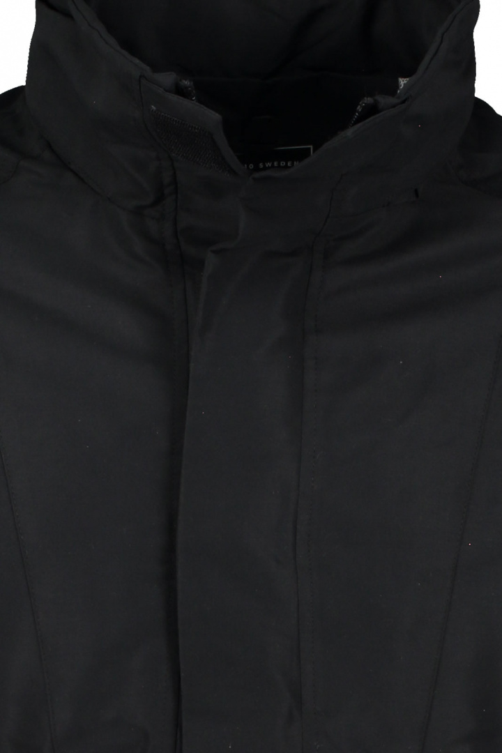 - Hög krage med dold luva