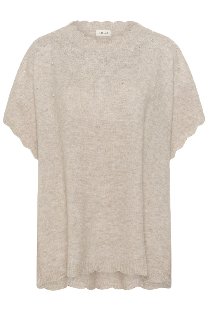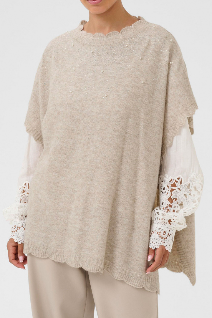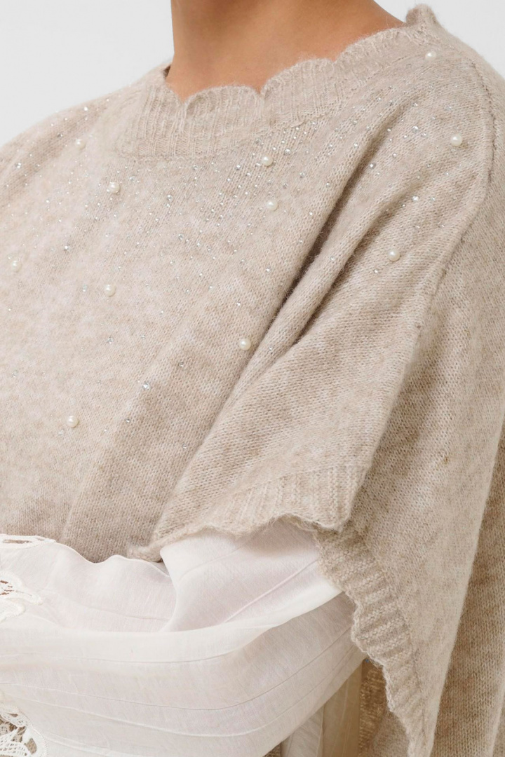 Cremanuella Poncho Tröja från Cream är en mjuk, elegant poncho i normal passform som passar lika bra till jobbet som till vardags. Den runda halsringningen ramar ansiktet på ett snyggt sätt medan den finstickade strukturen ger en exklusiv känsla och behaglig komfort. Som en diskret glimt av glamour präglas designen av strass- och pärldetaljer som fångar ljuset utan att överdriva. Denna kombination gör ponchon till ett statementplagg som enkelt kan lyfta din outfit.