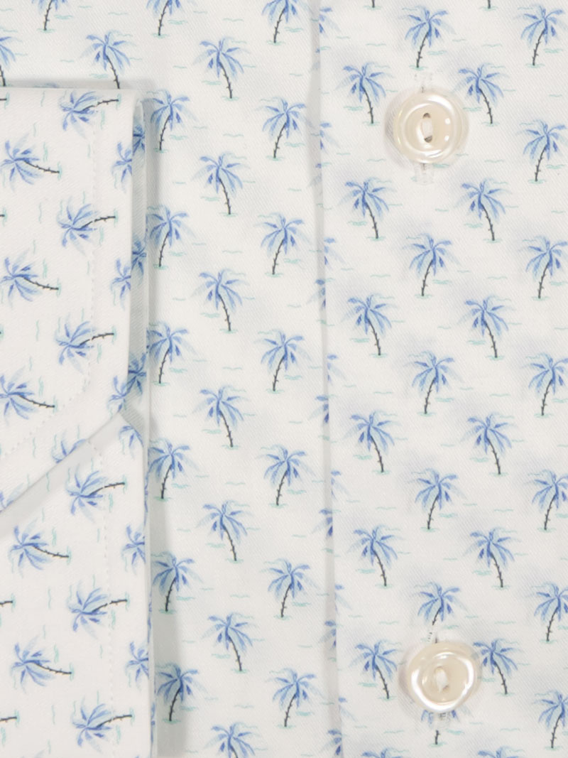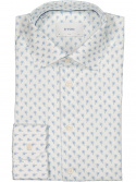 Mönstrad yta med diskreta, samtida detaljer; cut away-krage som öppnar upp för slips eller luftig knäppning, samt vinklade manschetter som höjer helhetsintrycket.