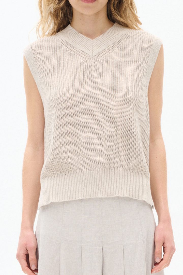 Tillverkad i en mjuk bomull- och linneblandning består västen av 55% bomull och 45% linne. Den naturliga kombinationen gör plagget andningsbart och behagligt mot huden samtidigt som linnets drape och struktur ger en lätt, elegant känsla som passar både vårens fräschhet och sommarens lättare klädsel. Denna sticksömnade väst är designad för vardagligt bruk utan att förlora en exklusiv känsla, vilket gör den till ett praktiskt och stilrent alternativ i din garderob.