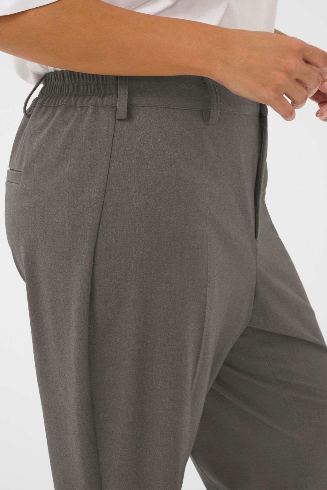 Materialet består av en genomtänkt blandning med 65% polyester, 30% viskos och 5% elastan, vilket ger ett stabilt fall, mjuk känsla mot huden och lite stretch för extra rörelsefrihet. Denna kombination gör byxorna tåliga i vardagen samtidigt som de behåller en snygg, professionell look hela dagen. Den stilrena designen gör det enkelt att kombinera med en blus och blazer för en formell kontorslook eller med en mer avslappnad topp för ett affärs-casual uttryck.