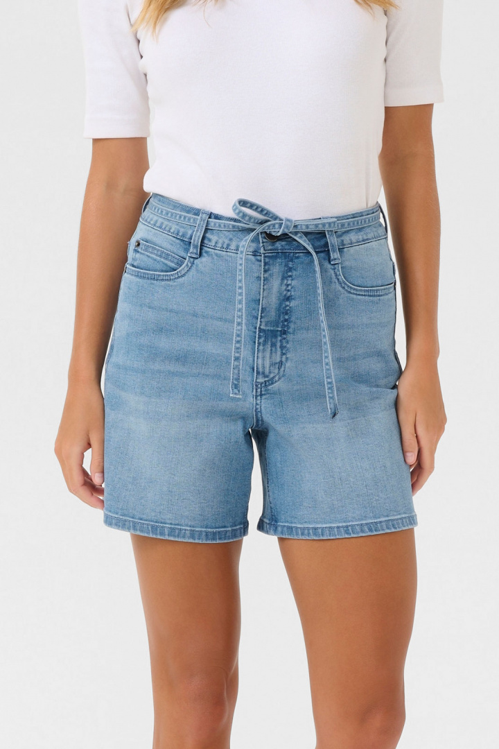 Materialet består av bomull 74%, elastan 1% och viskos 14%, vilket ger en mjuk känsla, bra komfort och lite extra stretch utan att tappa formen. Den mjuka blandningen ger rörelsefrihet hela dagen och den klassiska denimstrukturen behåller sin form tvätt efter tvätt. Med sin höga midja, raka ben och diskreta, men effektiva bälteffekt i midjan är Kasarah Denim Belt Shorts ett självklart val när du vill ha en avslappnad men stilfull look i sommarens garderob. Kombinera med sandaler och en enkel topp för en vardagslook eller komplettera med en skjorta för en lite mer uppklädd stil som fungerar lätt överallt.