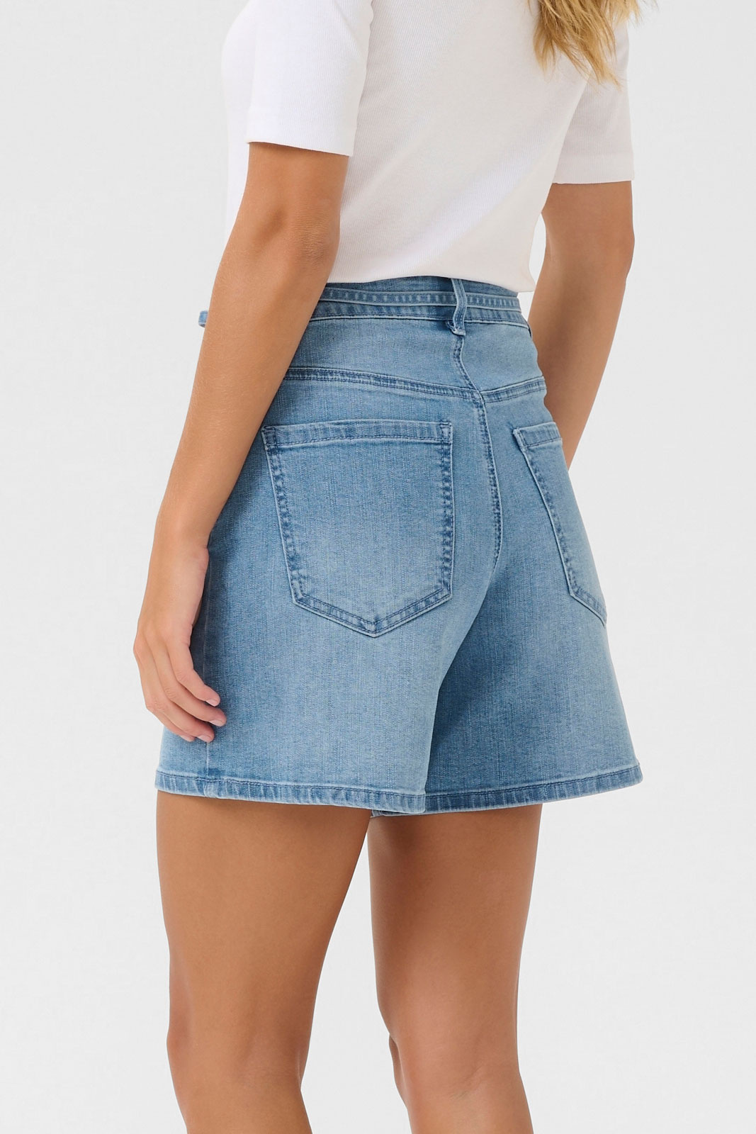 Kasarah Denim Belt Shorts från KAFFE erbjuder en modern jeanslook med hög midja och raka ben som skulpterar en smickrande silhuett. Shortsen har ett bälte i midjan som ger en trendig bälteffekt, tillsammans med en praktisk femficksmodell, knapp- och zipgylf och en snygg rivningston som passar både vardag och sommarens nöjen. Den rena designen gör det enkelt att matcha med allt från t-shirt till skjorta, och den tidlösa looken gör Kasarah till ett säkert tillskott i din garderob.
