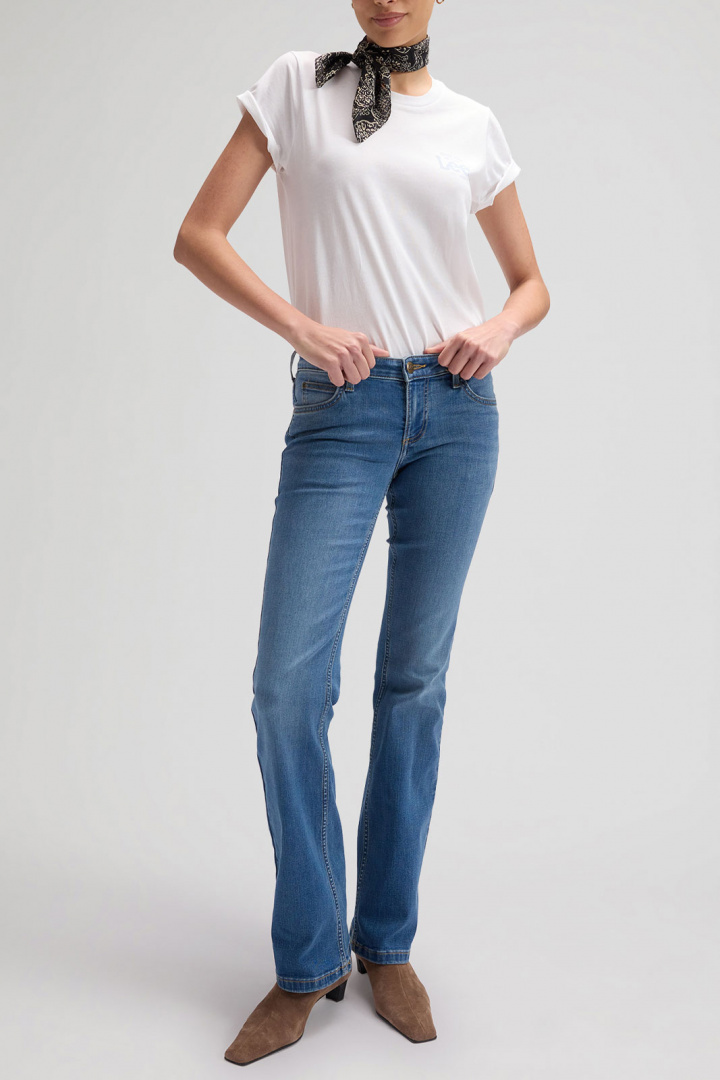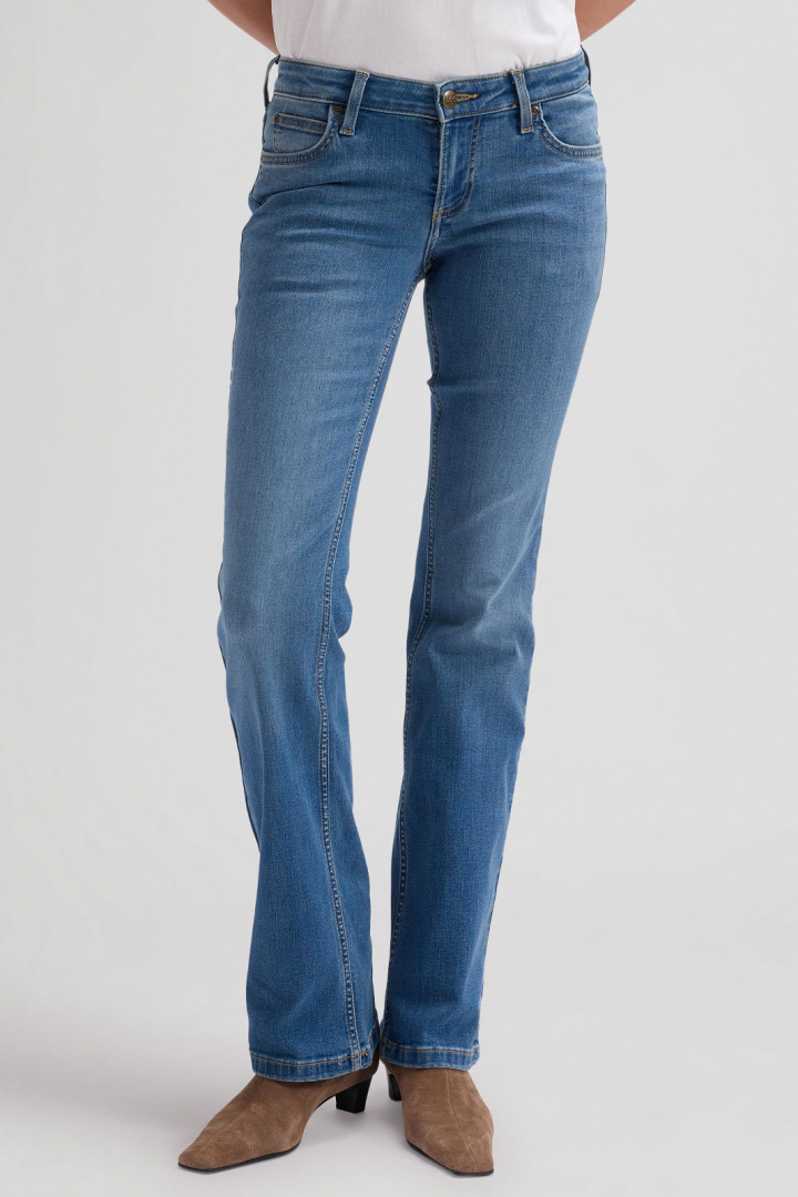 Upptäck Lee Jessica Jeans - en klassisk damjeans med låg midja och bootcut som förenar komfort, passform och en avslappnad, snygg stil. Den låga midjan skapar en modern silhuett som sitter bekvämt över höfterna, medan den mjukt vidareformen från knäet ner mot vristen ger en smickrande bootcut som passar både vardags- och fritidsoutfits. Denna femficksmodell har traditionell knapp- och zipgylf och en robust, tidlös design som gör den till ett säkert val i garderoben.