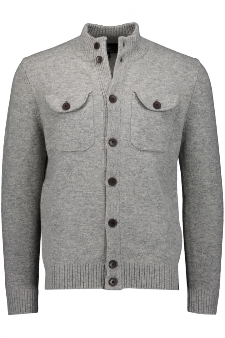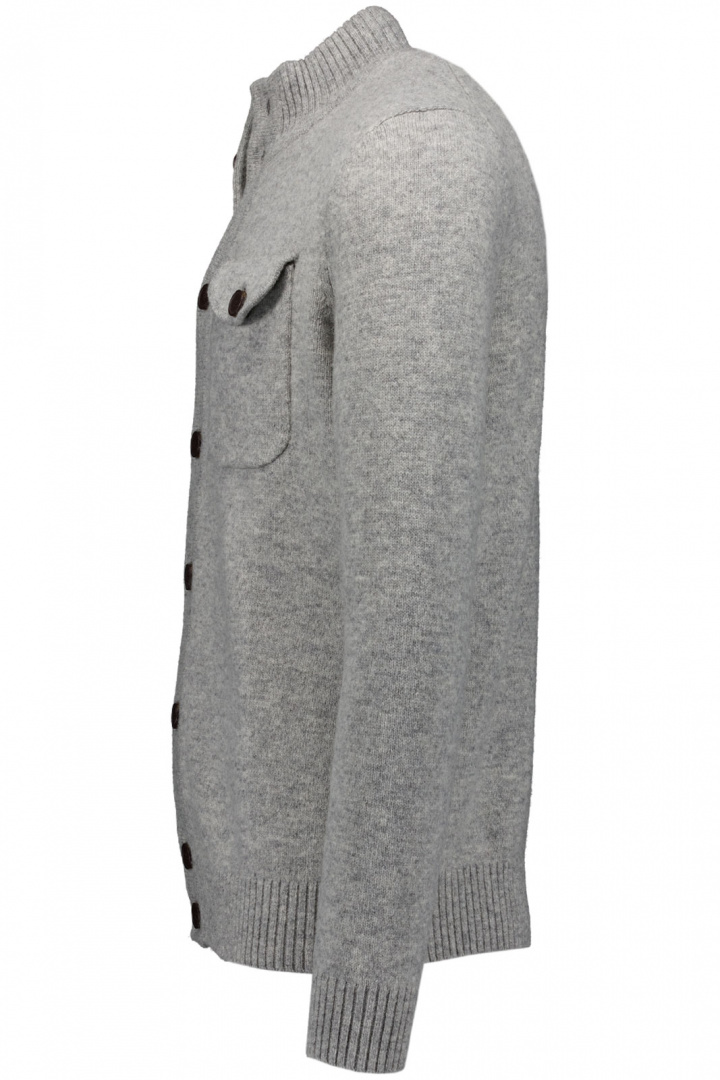 Materialet blandar 80% lammull med 20% nylon, vilket ger en len och bekväm känsla samtidigt som plagget behåller formen och tålamodet vid vardagligt bruk. Den stående kragen ger en modern touch till den annars klassiska cardiganen, medan frontknäppningen med knappar och de praktiska bröstfickorna med lock och knapp ger både stil och funktion. De ribbade detaljerna i kragen, ärmsluts och nedtill bidrar till en säker passform och bättre hållbarhet, så att plagget behåller sin form även efter flera tvättar.