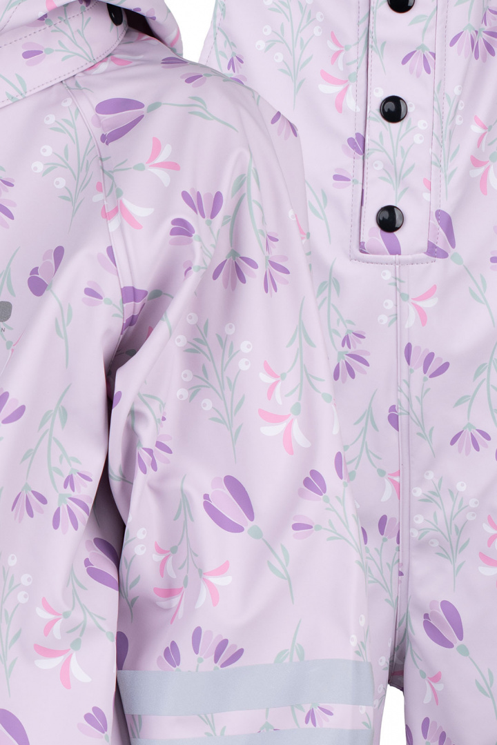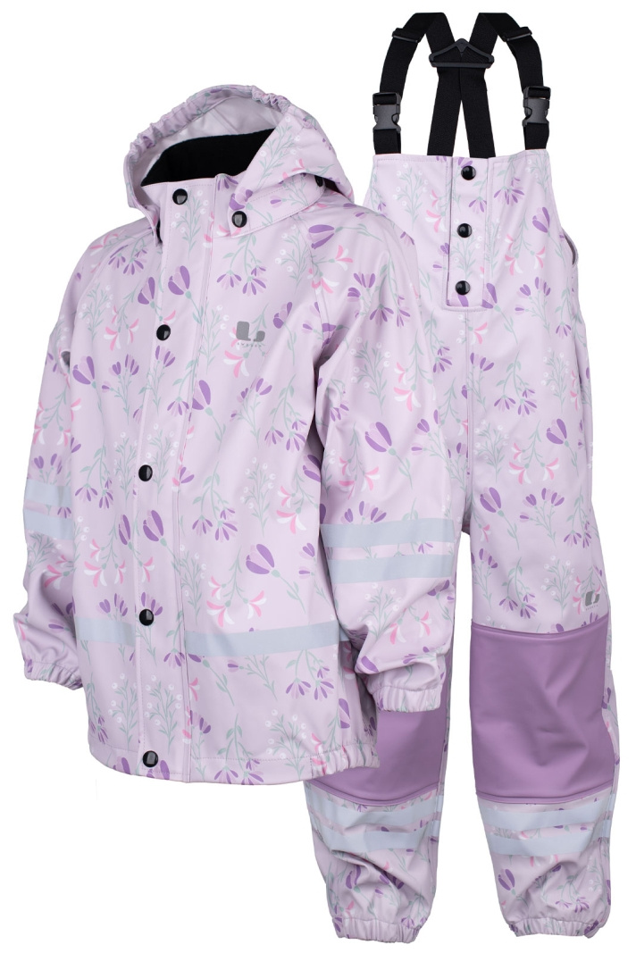 Material och konstruktion: Setet är tillverkat av polyuretan i 100%, vilket ger ett tåligt och vattentätt ytskikt som klarar vardagslek och regniga utflykter. Den kombinerade konstruktionen med svetsade sömmar och en vattenpelare på 8000 mm gör att kläderna håller fukten ute utan att kännas klumpiga eller tunga. Den dubbla PU-konstruktionen på knäna i byxorna ger extra slitstyrka där det ofta används mest, vilket gör setet särskilt lämpligt för aktiva barn som leker utomhus ofta.