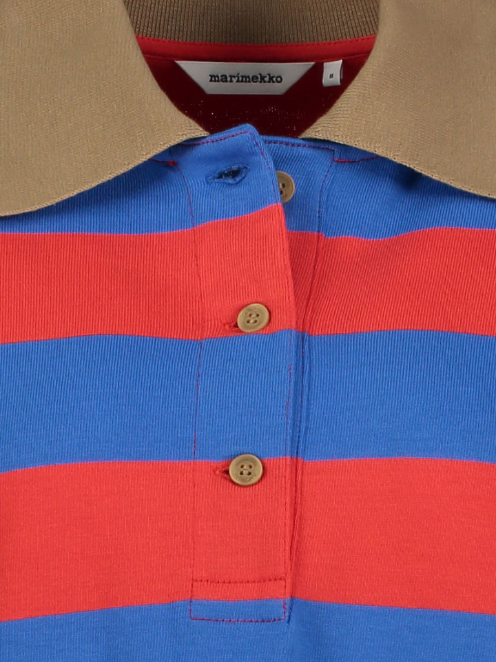 Klänning från Marimekko.Referenssi.Artikelnummer: 94274- Normal passform- Klassisk krage med knappknäppning- Mudd i ärmslut- Randig- Klänning damReferenssi från Marimekko - randig t-shirtklänning i 100% bomullEn tidlös och komfortabel t-shirtklänning från Marimekko, designad för vardag och lediga tillfällen. Den randiga modellen kombinerar klassisk skandinavisk enkelhet med signaturdetaljer som ger en sofistikerad men avslappnad känsla.Tillverkad i 100% bomull: mjuk, följsam och andas väl, vilket ger god komfort under hela dagen. Bomullsmaterialet är lättskött och behåller formen vid normalt bruk.Referenssi T-Shirt är ett mångsidigt val för dig som vill ha en bekväm, snygg och lättmatchad klänning. De klassiska detaljerna (krage, knappslå och mudd) lyfter helhetsintrycket utan att göra plagget formellt - perfekt för både vardag och helg. Ett naturligt och hållbart basplagg i garderoben för kvinnor som uppskattar kvalitet och enkel design.En stilren t-shirtklänning som förenar funktion och design — idealisk för den som söker en bekväm och elegant bas i garderoben.Tack för att du handlar i vår webbshop. Besök oss även i vår butik i Vingåker. Läs mer på www.vfo.se