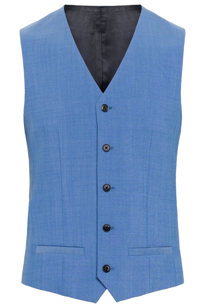Västen är tillverkad i en hållbar och komfortabel blandning: 40% ull, 58% återvunnen polyester och 2% elastan, vilket ger naturlig liv i tyget, bra värme och rörelsefrihet. Fodret består av 100% återvunnen polyester, vilket förstärker hållbarheten och ger en behaglig känsla när plagget tas på och tas av. Med slim fit följer västen kroppens konturer utan att kännas trång, vilket gör den lätt att bära tillsammans med en matchande kavaj eller som en fristående detalj i en mer avslappnad formell look.