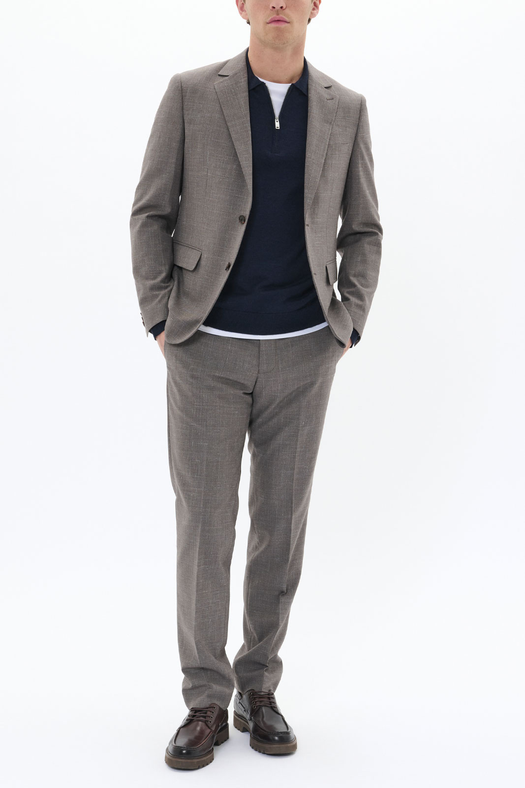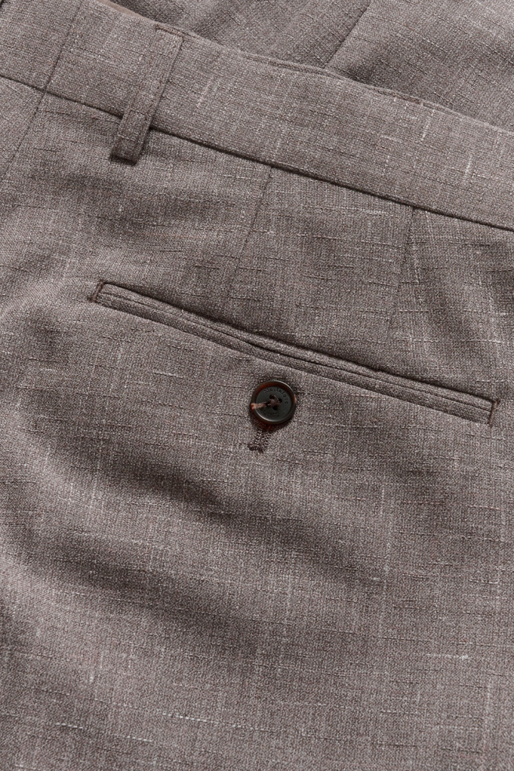 Fodret är gjort av 100% återvunnen polyester, vilket ger en mjuk känsla mot kroppen och gör valet lite mer miljömedvetet. Själva tyget består av en väv som blandar 50% polyester och 40% ull, vilket ger en fin ullkänsla, bra temperaturreglering och hållbarhet utan att tumma på komforten. Denna kombination av material ger en elegant struktur samtidigt som den är bekväm att bära hela dagen.