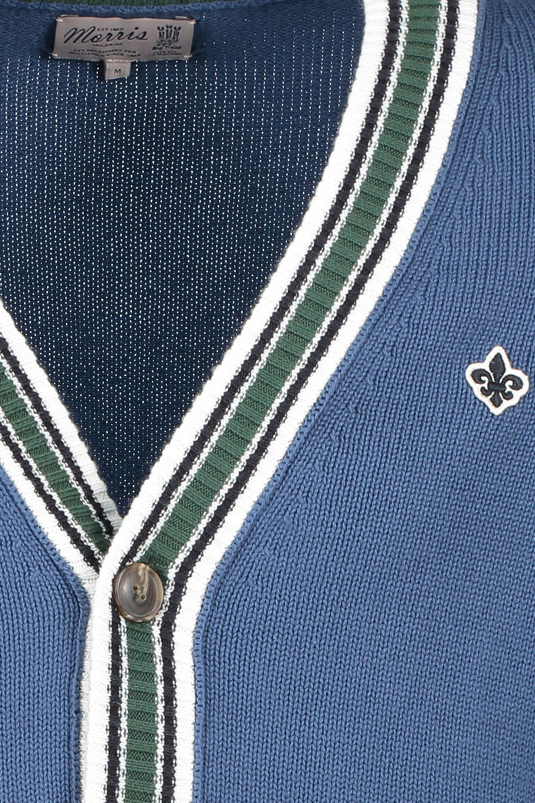 Cardigan från Morris.Marvell Cardigan.Artikelnummer: 90110400- Normal passform- V-ringad- Knappknäppning framtill- Broderat logotyp- Ribbad mudd i krage, ärmslut och nedtill- HerrcardiganTack för att du handlar i vår webbshop. Besök oss även i vår butik i Vingåker. Läs mer på www.vfo.se
