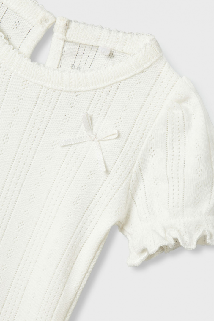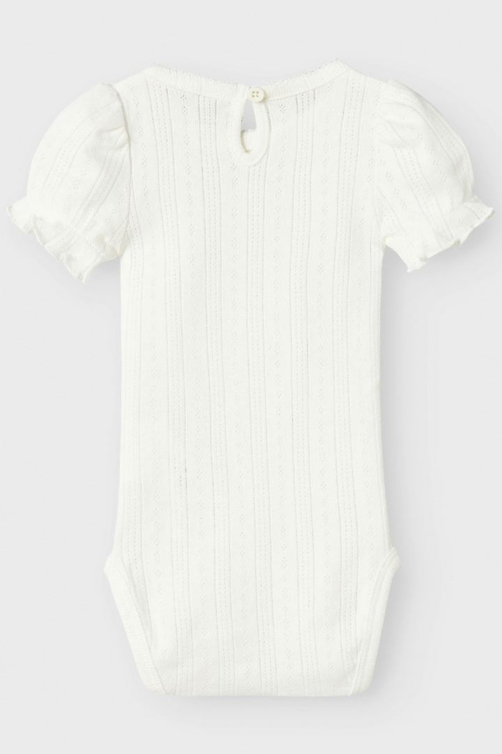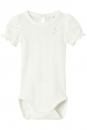 NBFHappy SS Body har en rundad halsringning som ger ett mjukt och bekvämt intryck, samt en praktisk knapp i nacken för enkelt på- och avklädande. De smarta tryckknapparna i grenen gör blöjbyten till en lek, vilket är perfekt för aktiva små barn. Den söta rosettdetaljen ger en fin touch av lekfullhet samtidigt som den behåller en stilren look.