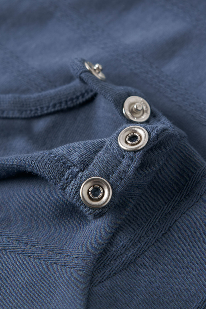 Tillverkad av 95% ekologisk bomull och 5% elastan får kroppen röra sig fritt samtidigt som plaggens form hålls. Den naturliga bomullen känns len mot barnets hud och elastanen ger lite extra stretch för en bättre passform genom hela dagen. Praktiska tryckknappar sitter vid axeln och i grenen - smidigt för på- och avklädning och för bekväma blöjbyten utan onödigt krångel.
