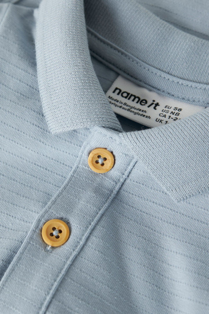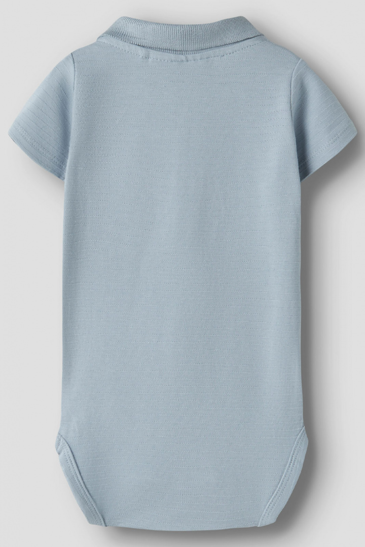 Den klassiska kragen med knappar ger en tidlös och stilren look som passar perfekt för både vardagsbruk och mer högtidliga tillfällen. De praktiska tryckknapparna i grenen gör det enkelt att byta blöja, vilket skapar en smidig och stressfri upplevelse för både barn och föräldrar.