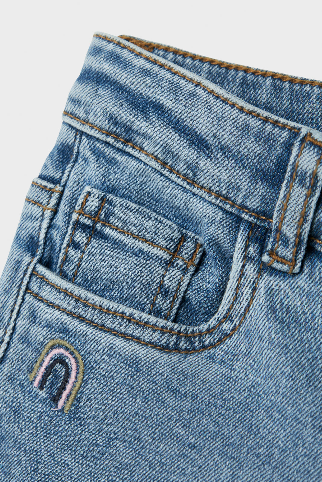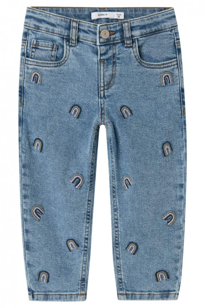 Nmfbella Mom Emb Jeans 1224-fr Noos från Name It - Normal midja är en bekväm och stilren barnjeans som passar vardagens lek och aktiviteter. Den klassiska passformen med normal midja och en avsmalnande silhuett ger den efterlängtade mom-jeans-känslan utan att kompromissa med rörelsefrihet. Den justerbara resåren i midjan med knapp gör att jeansen enkelt kan anpassas när barnet växer, och den praktiska knäppningen med tryckknappar underlättar när barnet själv vill klä sig. Med femficksmodell och det broderade, tryckta motivet får plagget en unik och lekfull detalj som barnet kan känna igen sig i. Materialet består av 79% bomull, 20% ekologisk bomull och 1% elastan, en mjuk och stretchig bomullsblandning som ger komfort och rörelsefrihet genom hela dagen utan att tappa formen. Denna jeans är ett klokt val för aktiva barn som vill känna sig bekväma, se bra ut och samtidigt bidra till en bättre miljö tack vare den ekologiska bomullen.