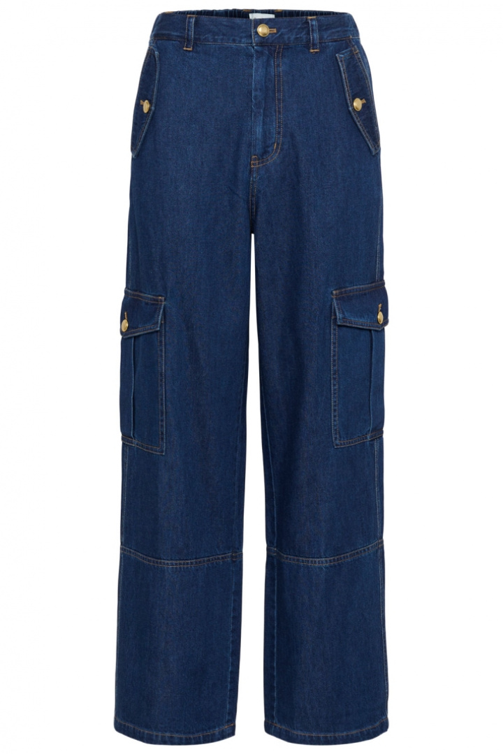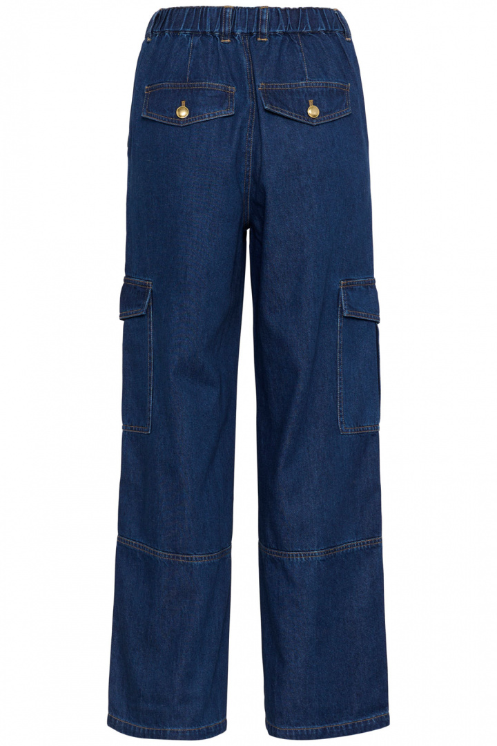 Designen är praktisk och väl genomtänkt: öppna sidofickor för enkelt tillträde, imitationsfickor baktill för en ren front, samt benfickor med lock och knapp som tillför en subtil, utilitaristisk detalj. Skjuts av knäppning och zip gör den lätt att ta på och av, medan den klassiska rivningen i materialet behåller den rätta jeanskänslan. Denna byxa är skapad för att vara en bekväm vardagsfavorit som enkelt kan stylas upp eller ner efter tillfälle.