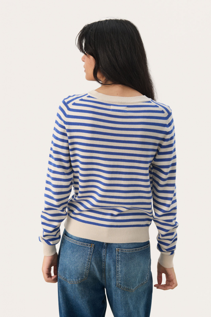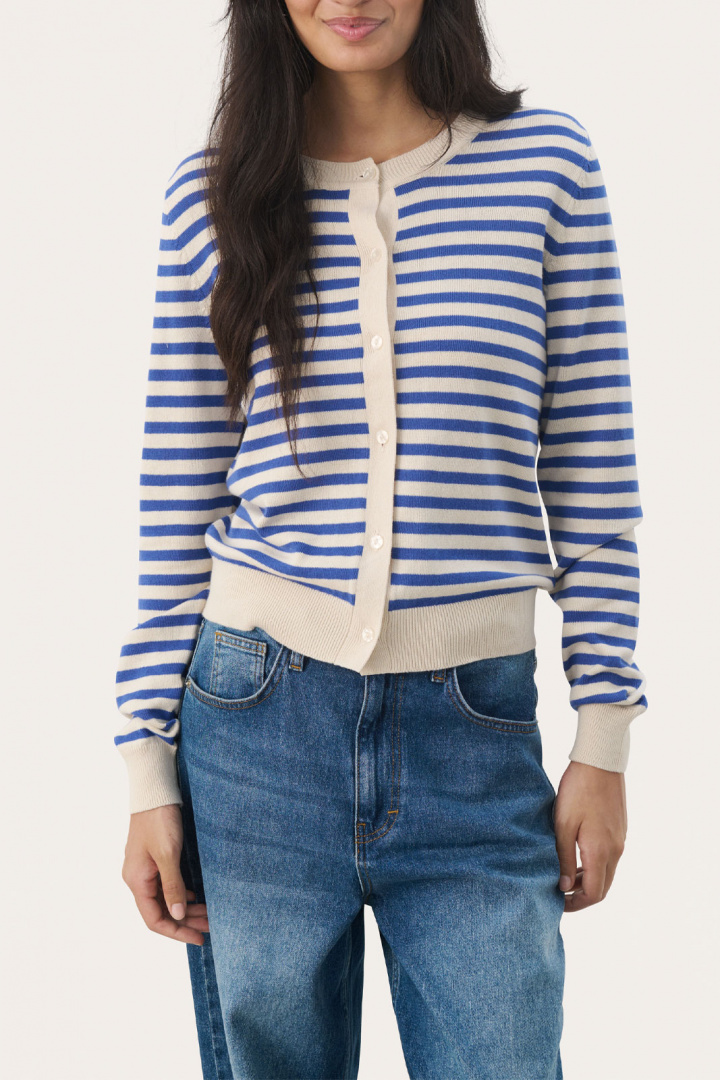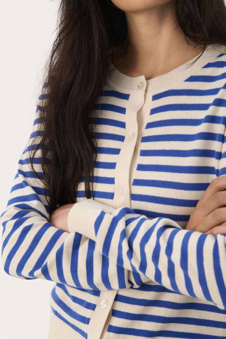 Kofta från Part Two.Tanishapw Ca.Artikelnummer: 30308325- Normal passform- Rund halsringning- Knappknäppning framtill- Stickad- Ribbad mudd i krage, ärmslut och nedtill- Randig- Kofta damTanishapw Ca Tröja från Part Two - En tidlös klassiker för damUpptäck den eleganta och mångsidiga Tanishapw Ca Tröjan från Part Two, som kombinerar stil och komfort på bästa sätt. Denna stickade kofta har en normal passform som passar perfekt för alla kroppstyper, vilket gör den till ett utmärkt val för varje garderob.Koftan har en rund halsringning och en praktisk knappknäppning framtill, vilket gör den enkel att ta på och av. Ribbad mudd i krage, ärmslut och nedtill ger ett sofistikerat utseende och bidrar dessutom till en perfekt passform. Med sin tidlösa design är Tanishapw Ca Tröjan en perfekt layering-piece som enkelt kan kombineras med både byxor och klänningar, vilket gör den idealisk för både arbete och fritid.Tillverkad av 100% bomull är denna tröja inte bara mjuk och behaglig mot huden, utan också lätt att sköta. Bomull är ett andningsbart material som gör att du kan känna dig fräsch hela dagen, oavsett aktivitet. Den hållbara och kvalitativa konstruktionen gör att denna kofta kommer att bli en trogen följeslagare säsong efter säsong.Välj Tanishapw Ca Tröjan från Part Two för en kombination av stil, komfort och hållbarhet. Den är perfekt för den moderna damen som värdesätter både fashion och funktionalitet. Lägg till ett extra lager av värme utan att kompromissa med din stil. Denna kofta är inte bara ett plagg, utan en investering i din garderob.Gör Tanishapw Ca Tröjan till en del av din stiliga samling idag och upplev skillnaden i kvalitet och design!Tack för att du handlar i vår webbshop. Besök oss även i vår butik i Vingåker. Läs mer på www.vfo.se