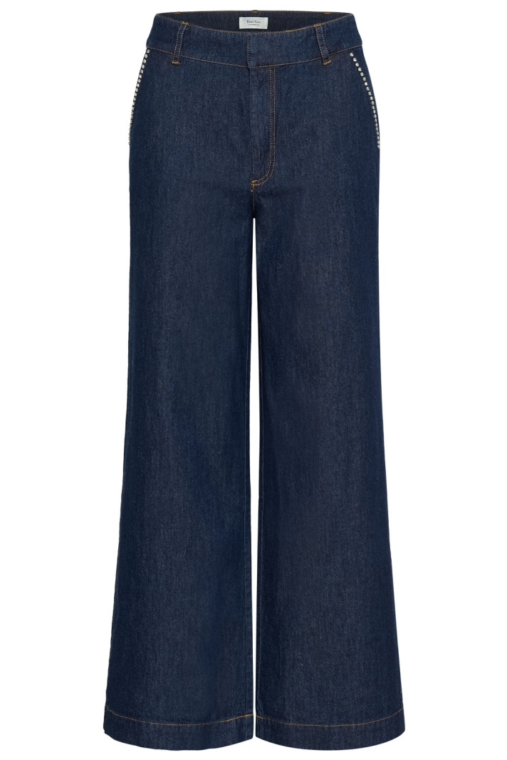Ursulapw Je Jeans från Part Two är en damjeans med normal midja och raka ben som passar lika bra till vardag som till lite mer uppklädda tillfällen. Den normala midjan ger en bekväm passform runt höfterna, medan de raka benen skapar en tidlös silhuett som enkelt matchas med allt från sneakers till klackar. Den öppna sidofickesignen ger en avslappnad, modern känsla, medan imitationfickor baktill ger en ren och stilren bakprofil. Hake och zipgylf erbjuder en klassisk stängning som känns trygg och praktisk i vardagen, och de diskreta strassdetaljerna ger en subtil glamour som lyfter outfiten utan att överdriva. Tillverkad i 100% bomull känns tyget mjukt mot huden och andas bra, vilket gör jeansen bekväma att bära hela dagen. Detta gör Ursulapw Je Jeans till ett klokt val för den som vill ha en snygg, hållbar vardagslook med en liten gnista i detaljen. Kombinera med en enkel t-tröja och sneakers för en avslappnad stil, eller addera en blus och klackar för en mer dressad look. Denna modell från Part Two är ett stabilt val i garderoben som behåller sin form och färg över tid.