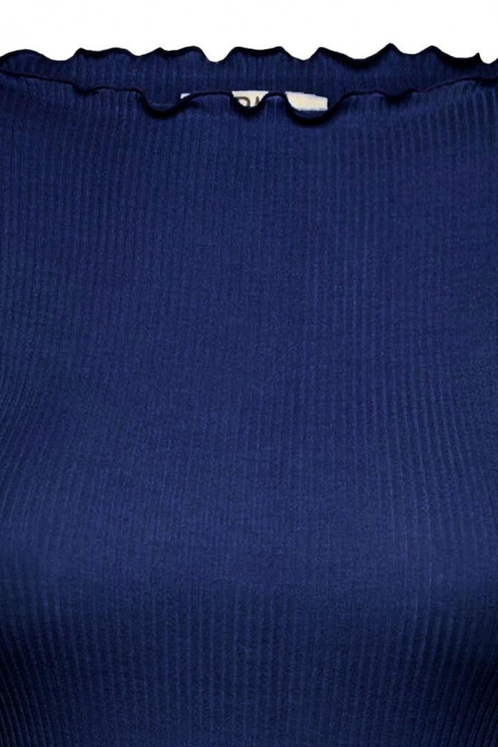 T-shirten har en delikat rundad halsringning som ger en elegant touch, vilket gör den mångsidig för både vardag och fest. Rullfåll vid krage, ärmslut och nedtill bidrar till en modern och avslappnad look. Det ribbade tyget ger en dynamisk struktur som höjer stilnivån på denna klassiska T-shirt.