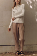 Designen är genomtänkt för komfort och stil. Ribbstickat avslut nedtill ger en stabil och avslappnad finish som håller formen dag efter dag, medan rullfållen nedtill ger en modern, avslappnad effekt som passar bra över midjan. Den figurnära passformen framhäver kroppskonturen på ett smidigt sätt utan att kompromissa med rörelsefrihet, vilket gör att toppen verkligen fungerar som ett mångsidigt plagg i din garderob.