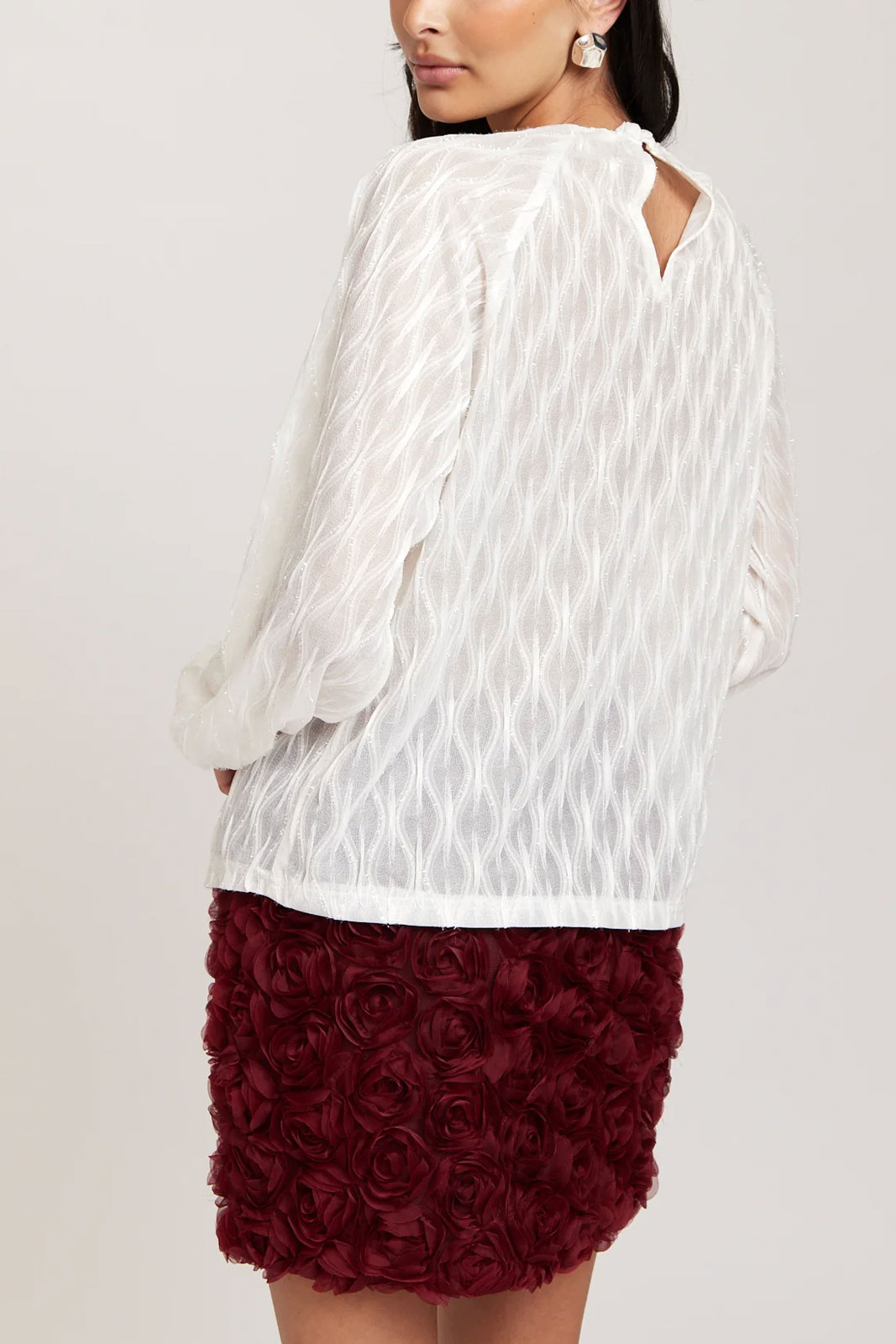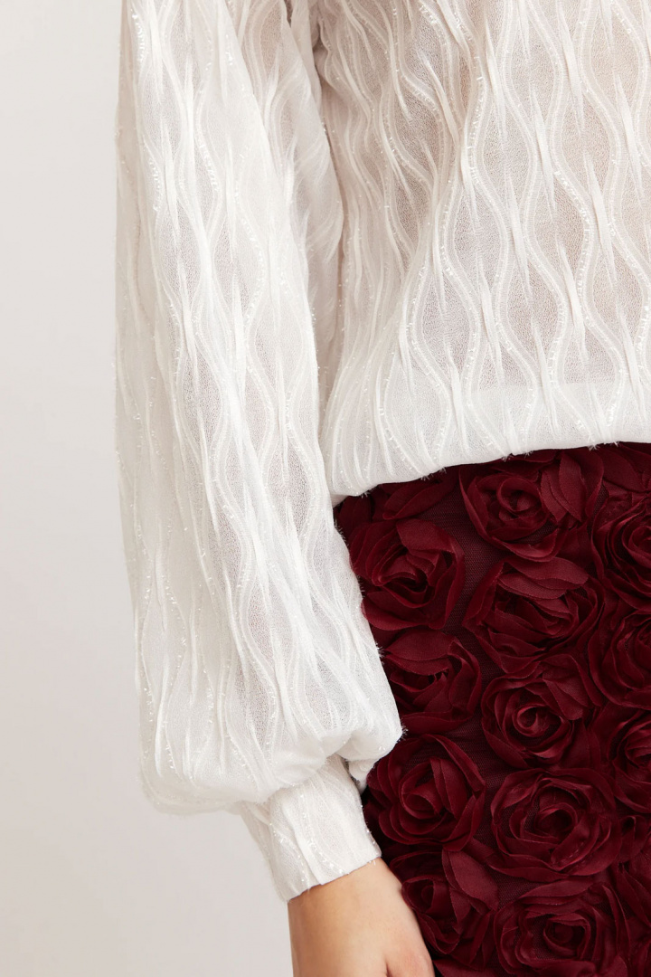 Mimmi Blouse från Rut & Circle är en damblus i normal passform som förgyller garderoben med en diskret glittrig finish. Den rundade halsringningen ger ett mjukt och tidlöst uttryck, medan en knapp i nacken ger en fin detalj och möjlighet till justering. Resår i ärmsluten skapar en snygg, något puffig silhuett och bekväm passform som passar både vardag och fest. Den glittriga ytan fångar ljuset på ett elegant sätt utan att överdriva, så blusen kan användas som en stilren bas eller som statementsplagg i en mer uppklädd look. Tillverkad av 95% polyester och 5% elastan ger materialmixen bra drape och lätt stretch för rörelsefrihet och komfort. Mimmi Blouse är ett mångsidigt val som enkelt kan stylas med både kjol och byxa, vilket gör den till ett smart köp för kontoret såväl som helgaktiviteter. Välj denna blus från Rut & Circle för en modern, bekväm och glamorös stil som håller länge.