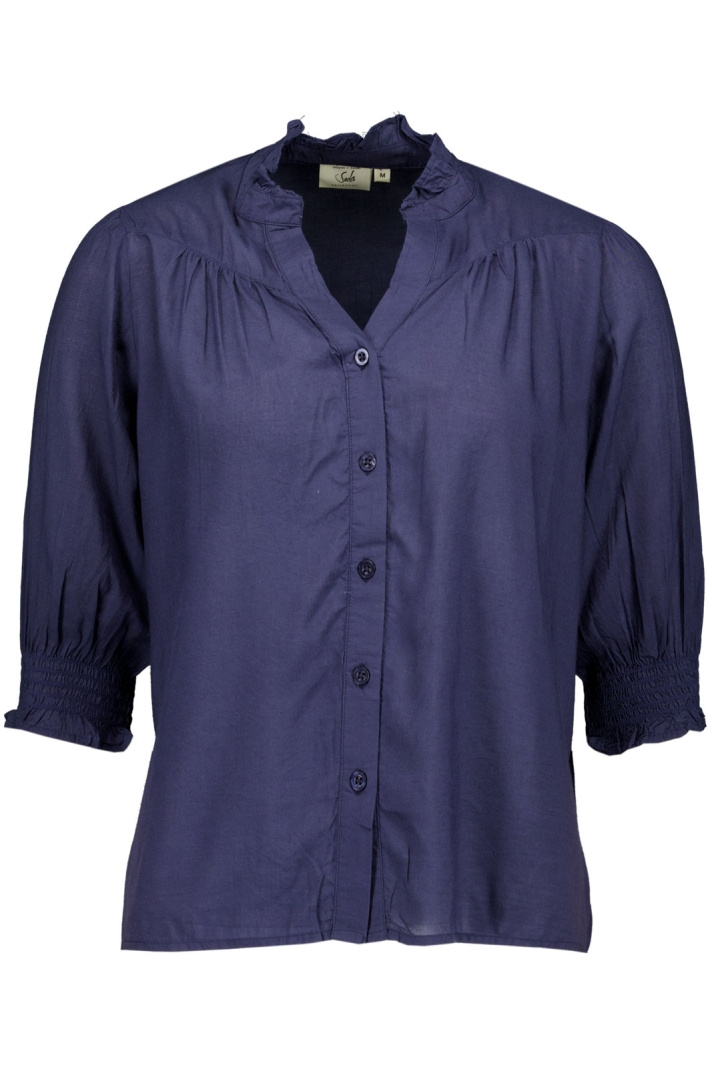 Upptäck Blus 26700 Soda från Soda - en damblus i normal passform som kombinerar klassisk enkelhet med mjuk komfort. Den V-ringade halslinningen ger en elegant, tidlös look och den praktiska knappknäppningen framtill gör den enkel att styla för olika tillfällen. Resåren i ärmsluten skapar en snygg siluett och håller ärmarna bekvämt på plats oavsett aktivitet.