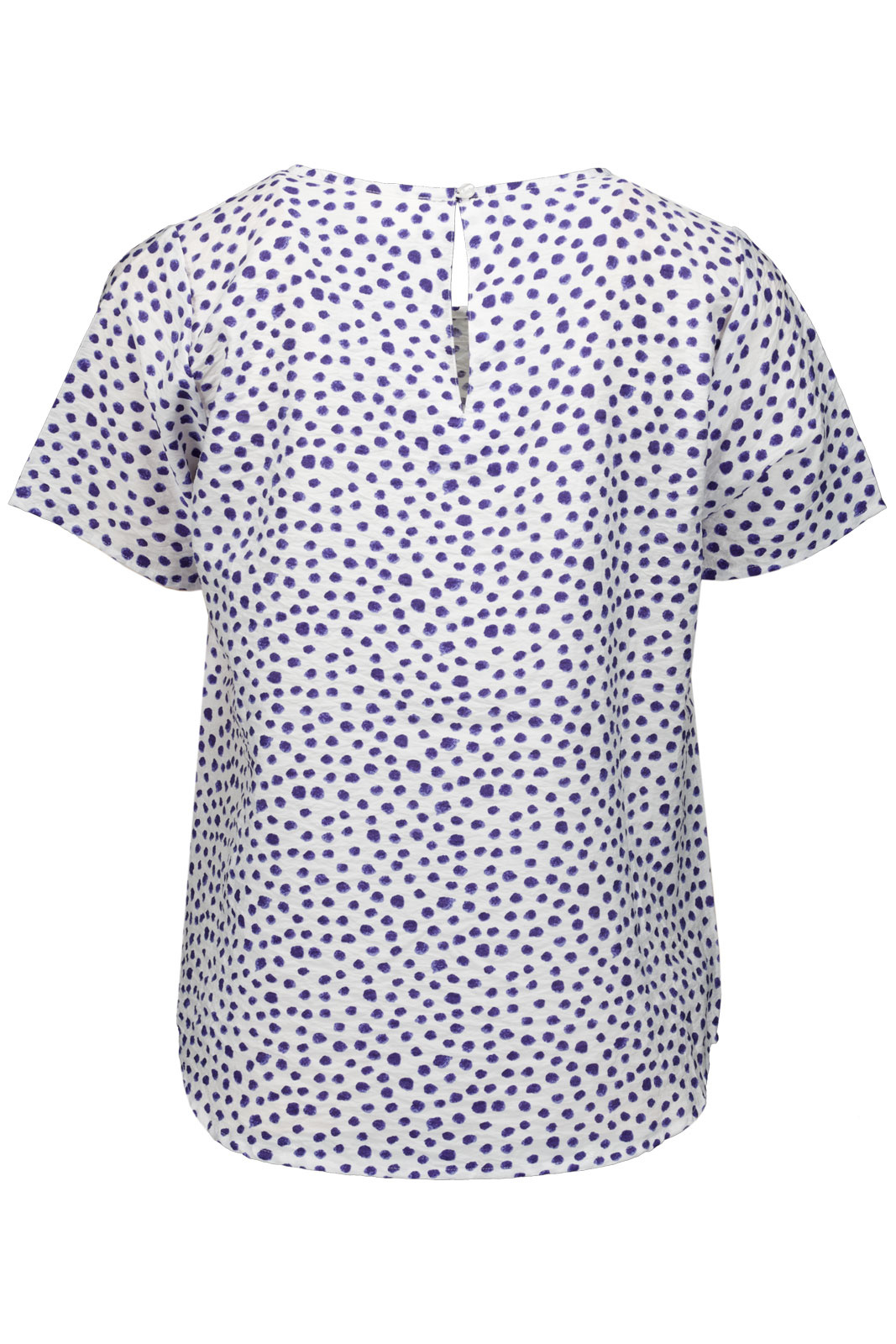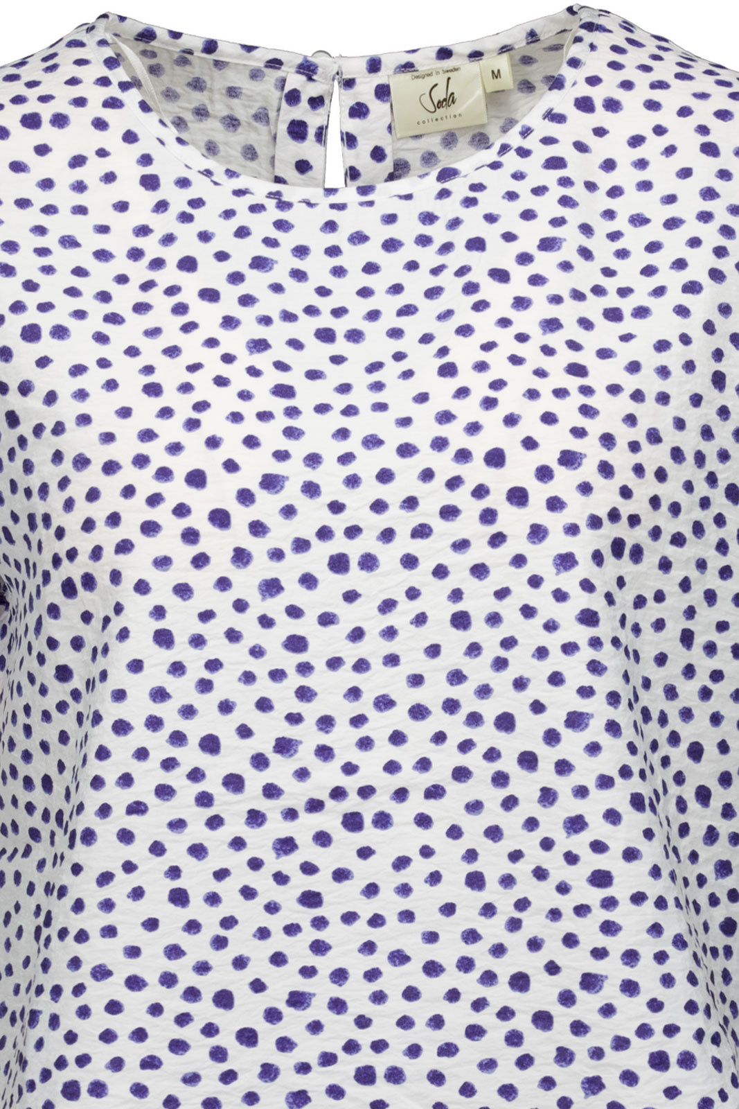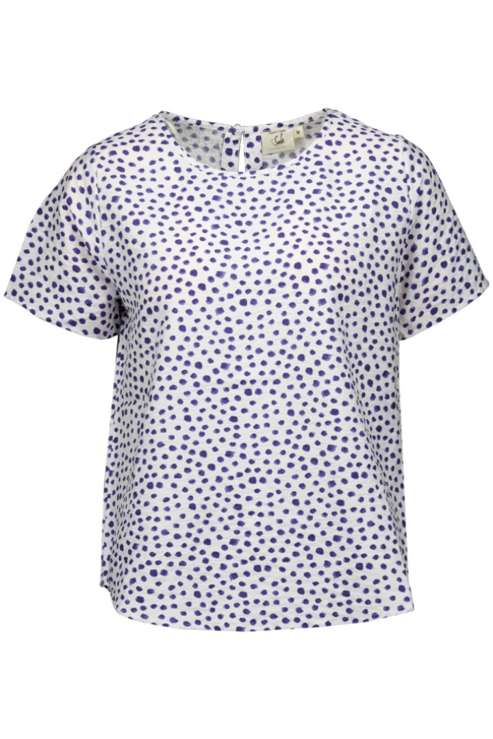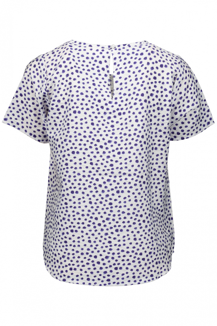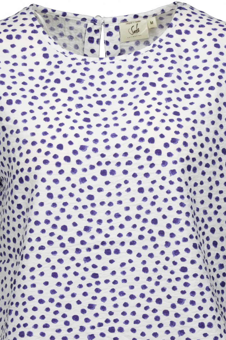 Upptäck Topp 26114 Soda - en damtopp i normal passform som förhöjer din vardagsstil med en mjuk, draperad silhuett och en lekfull mönstrad design. Den rundade halsringen ger en tidlös look som känns både avslappnad och elegant, medan knappen i nacken tillför en subtil designdetalj och gör påtagning enkel.