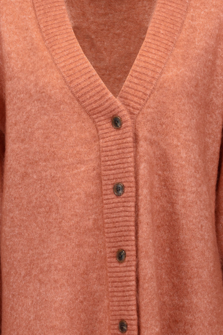 Den V-ringade halsen ger en smickrande, feminin siluett samtidigt som den klassiska frontknäppningen i-knapp ger dig möjligheten att justera stilen efter tillfälle. Den ribbade muddningen runt kragen, ärmsluten och nedtill skapar en tydlig struktur och hjälper plagget att behålla sin form, samtidigt som den bidrar till extra värme där det gör mest nytta. Den här stickade koftan känns både mjuk och lyxig mot huden, tack vare sin speciella blandning av material.