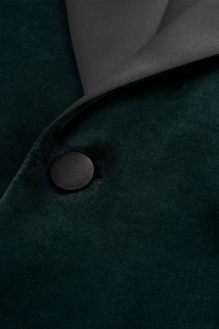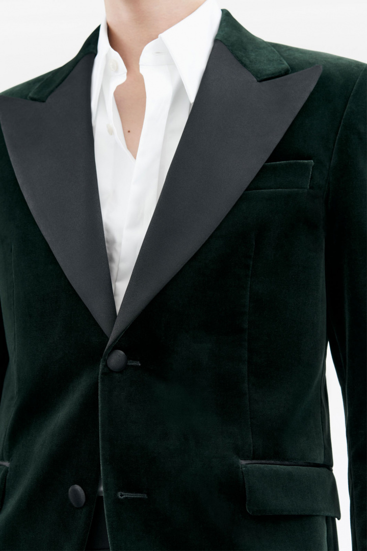 Smokingkavaj från Tiger of Sweden.Jeffers.Tygnummer: T71393Färgkod: 4EV- Slim fit- Helfodrad- Vadderade axlar- Två knappar framtill- Två fickor med lock- Öppen bröstficka- Dubbelsprund- Sammet- Kavaj herrTack för att du handlar i vår webbshop. Besök oss även i vår butik i Vingåker. Läs mer på www.vfo.se