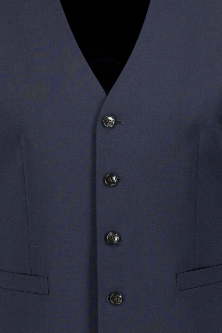 Västen är tillverkad i en hållbar ull- och polyesterblandning (44% ull, 54% återvunnen polyester) med 2% elastan, vilket ger naturlig elegans med ett lätt stödjande streck. Den återvunna polyesterblandningen bidrar till slitstyrka och formhållning, medan ullen bidrar till ett fint drape och temperaturreglering. Det tunna inslaget av elastan ger extra rörelsefrihet utan att kompromissa med den skarpa silhuetten som kännetecknar en slim fit.