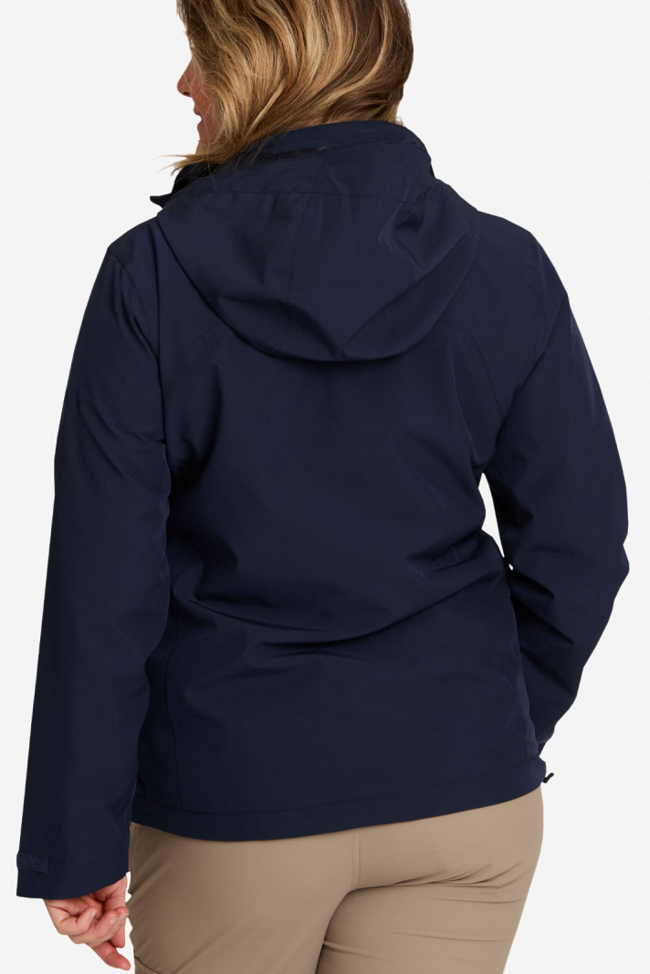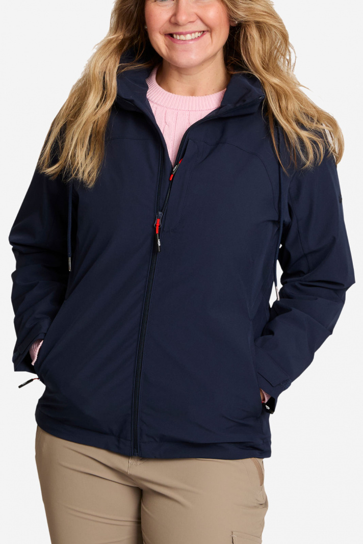 Elena Jacket från Tuxer är en damjacka i normal passform som kombinerar funktion och stil för alla dina friluftsäventyr. Den avtagbara huvan med dragsko ger flexibel skydd mot vind och lätt regn när du behöver det, medan den framåtlutande dragkedjan gör det enkelt att komma in och ur jackan. Två fickor med dragkedja och en bröstficka med dragkedja erbjuder trygg förvaring av nycklar, telefon och småprylar på vandringen eller i vardagen. Kardborrespänne i ärmslut och en justerbar dragsko nedtill gör det möjligt att anpassa passformen och hålla värmen där den ska vara. Denna friluftsjacka dam är vindtät och andas samtidigt, och tejpade sömmar förstärker skyddet mot väta och ökar hållbarheten i vått väder.