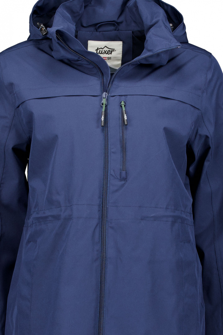 Harper Jacket från Tuxer är en mångsidig friluftsjacka för dam i normal passform som kombinerar skydd mot väder med komfort i vardagen. Den avtagbara luvan med dragsko ger möjlighet till extra skydd när vädret är kallt eller snävt, medan frontdragkedjan gör det enkelt att reglera ventilationen. Två fickor med tryckknapp och en bröstficka med dragkedja erbjuder praktiska förvaring för nycklar, telefon och småsaker. Kardborrespänne i ärmslutet håller vind och kyla ute när du rör dig i snäva terränger eller blåsigare dagar. Med 10 000 vattenpelare samt tejpade sömmar står jackan emot regn och fukt samtidigt som den är vindtät och andas bra för att hålla kroppens temperatur balanserad under olika aktiviteter.