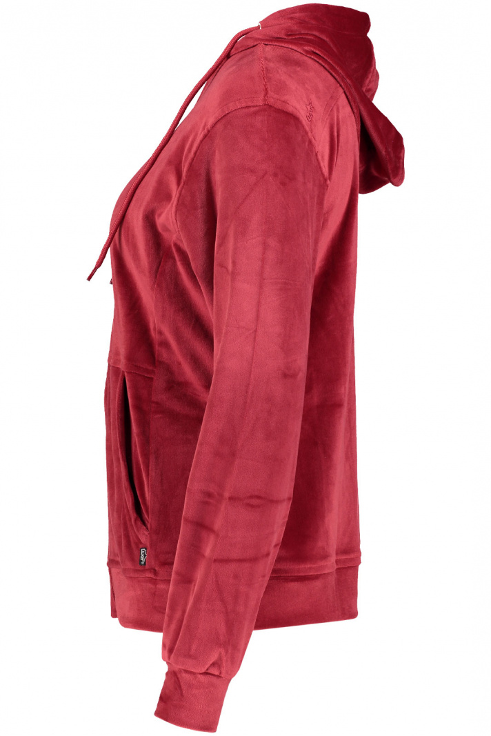 Tillverkad av en lyxig velourblandning av 95% polyester och 5% spandex, erbjuder denna hoodie en mjuk och följsam känsla mot huden. Velourens kvaliteter gör att tröjan andas, behåller sin form och ger en elegant finish. Mudd i ärmslut och nedtill säkerställer att värmen stannar inne och ger en perfekt passform.