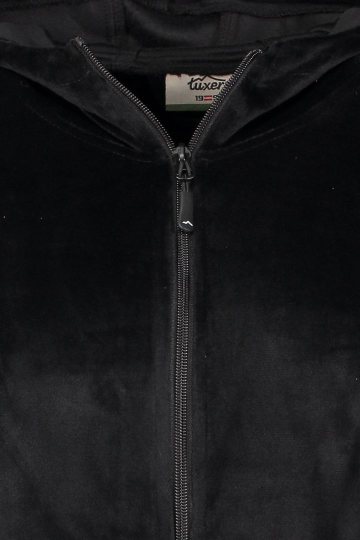 Tillverkad av en lyxig velourblandning av 95% polyester och 5% spandex, erbjuder denna hoodie en mjuk och följsam känsla mot huden. Velourens kvaliteter gör att tröjan andas, behåller sin form och ger en elegant finish. Mudd i ärmslut och nedtill säkerställer att värmen stannar inne och ger en perfekt passform.