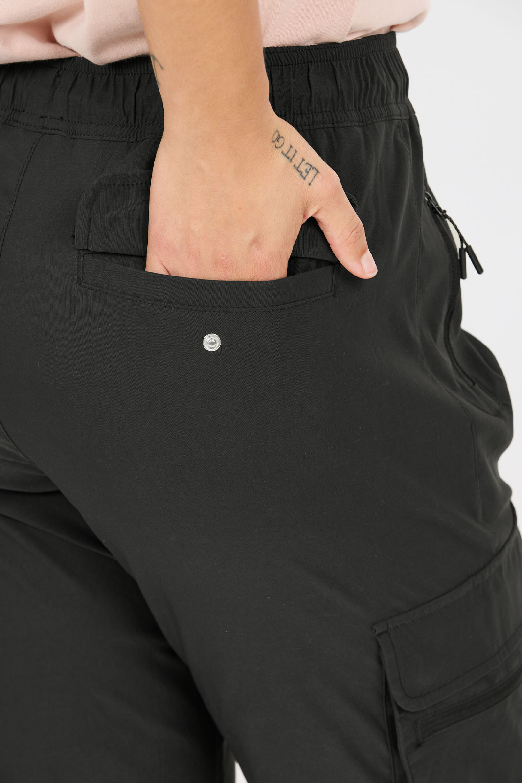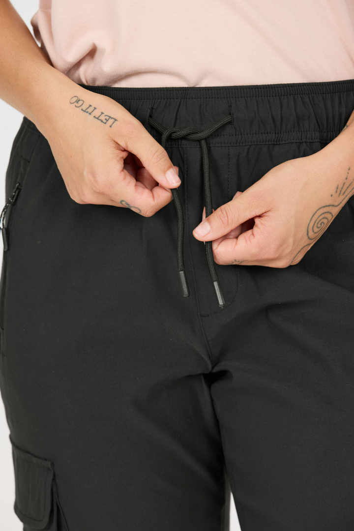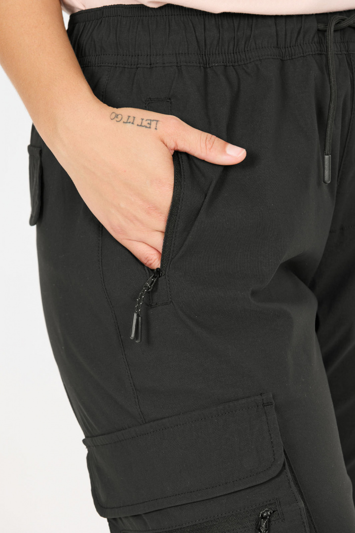 Byxans praktiska detaljer gör den till ett säkert val för aktiva dagar. Sidofickor med dragkedja håller nycklar och småsaker säkra under vandringen, medan benfickor och bakfickor med lock ger extra förvaring utan att skava mot kroppen. Resåren i benslutet ger en snygg avslutning och gör det enkelt att anpassa längden efter skostorlek och terräng.
